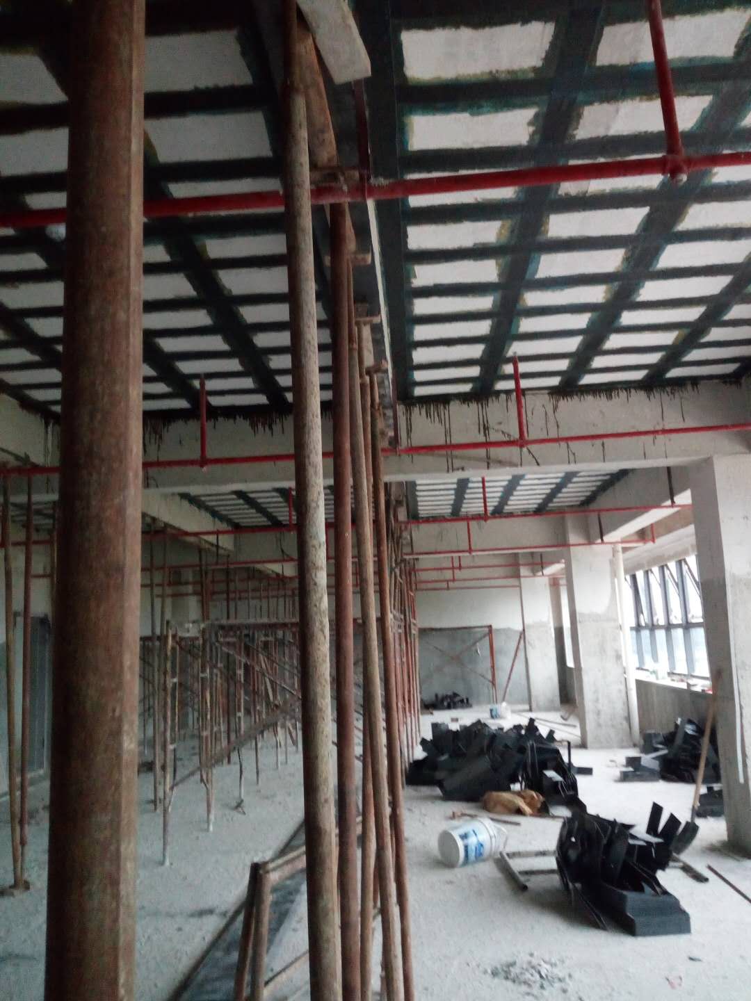 这两种方法的共同点是均需要通过结构胶受剪使钢板或碳纤维布与原构件共同工作,因此在加固部位必须要进行防火处理,由于一般的结构胶在60oC以上强度会降低,遇明火会燃烧。