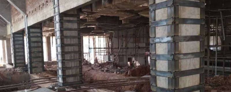 4.外包钢规格应由计算确定,角钢的厚度应≥5m,肢长应≥50mm; 沿梁轴线方向应每隔一定距离用扁钢制作的箍板或级板与角钢焊接。当有楼板时,附加螺杆穿过楼板,与U形箍板焊接。